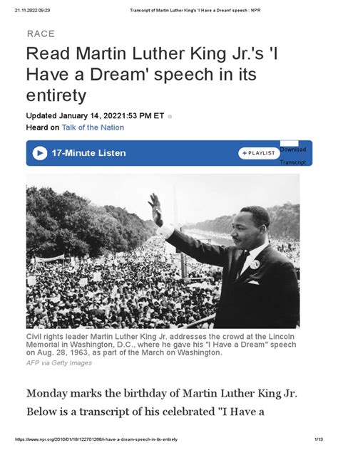 I Have A Dream Transcript. I am happy to join with you today in what will go down in history as the greatest demonstration for freedom in the history of. On august 28, 1963, some 100 years after president abraham lincoln signed the emancipation proclamation freeing the slaves, a young man named.